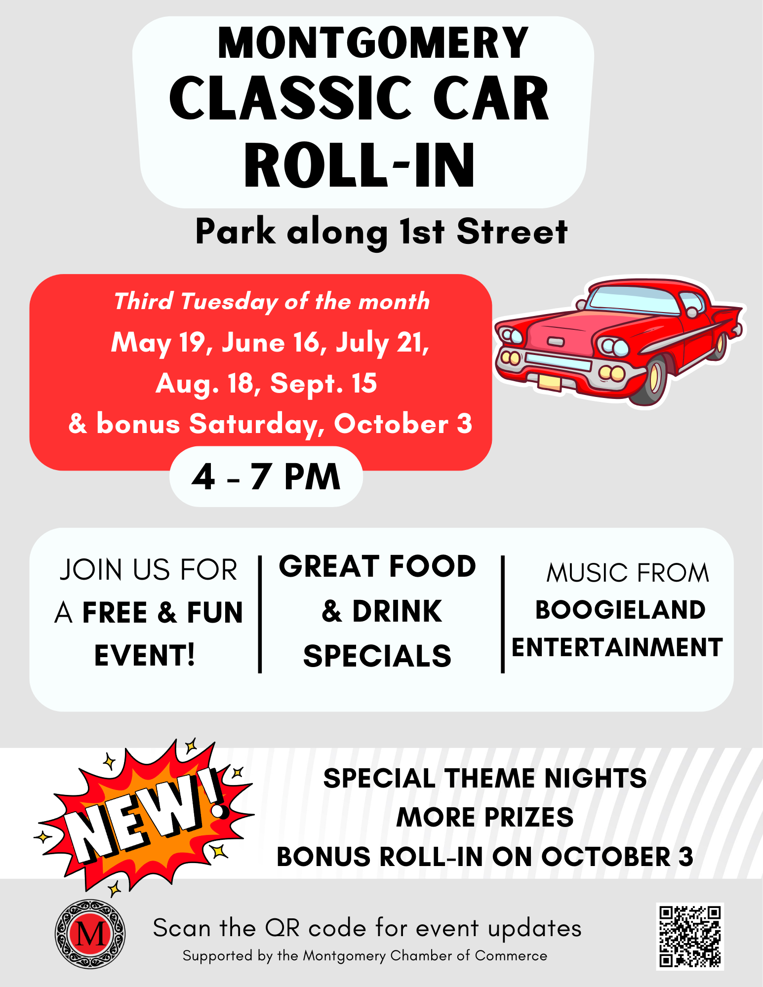 Join us for the Classic Car Roll-In series! Our Car Roll-Ins are fun for all types of classic car lovers, and especially those who enjoy a smaller, more community-focused event. Boogieland Entertainment gets Montgomery’s main street rockin’, and local bars, restaurants, and food trucks feature great deals and incredible food. There is no cost to attend. Bring your classic car or just come to look at the beauties.