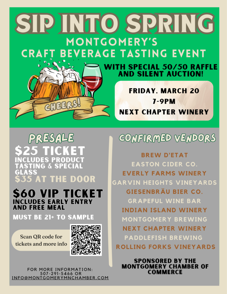 Join us for the third annual Sip into Spring event! Taste from a huge variety of local wine, beer and ciders. New this year is a silent auction and 50/50 raffle. All proceeds support the Montgomery Chamber’s events and activities which benefit the business community and the community at large.